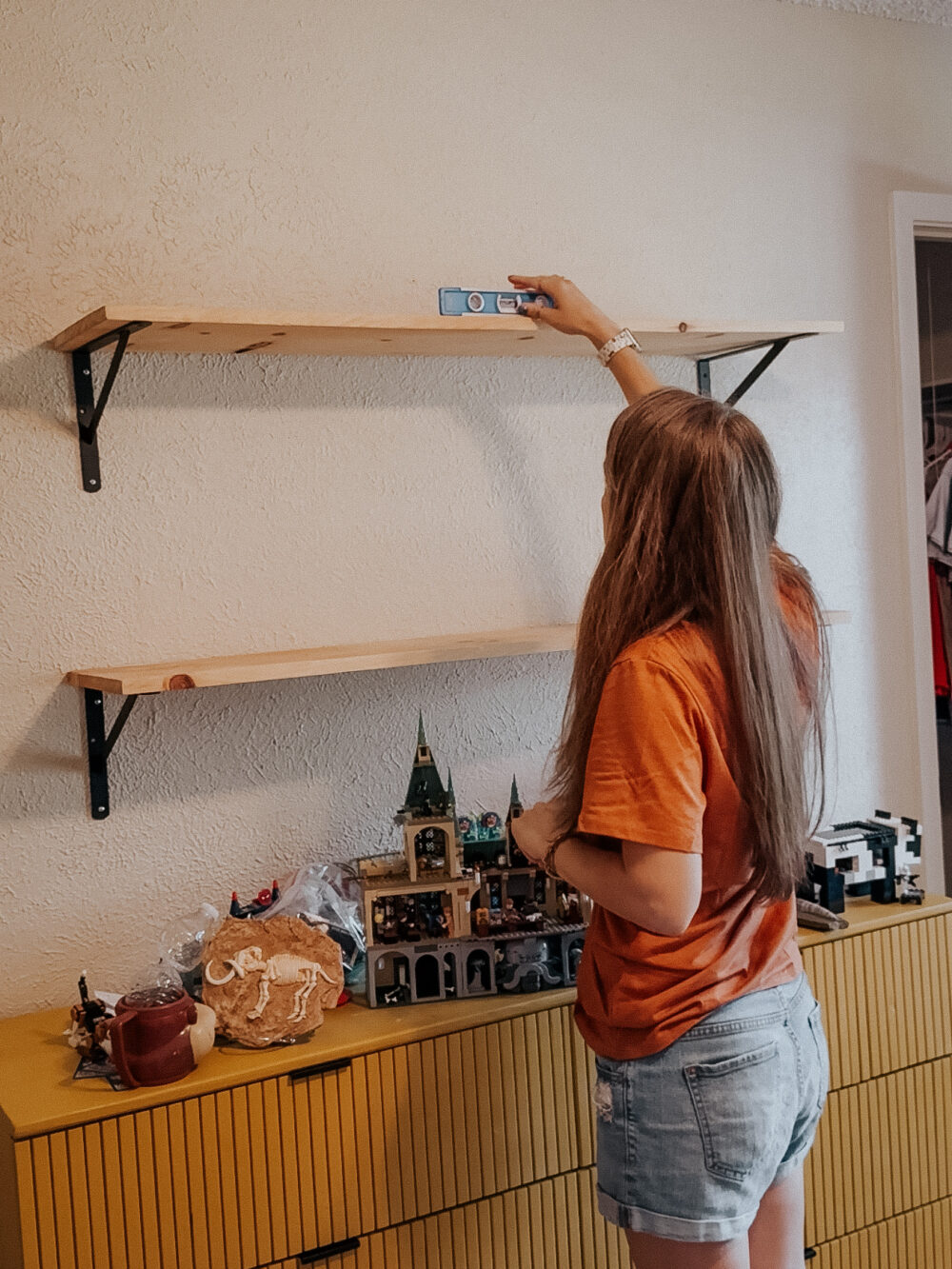 As you can see, I pushed the span limit of my shelves by only having two brackets on my shelves. But, I wasn’t worried about it since they’re only displaying LEGO and light toys on them. If they ever decide they’d like to display books or anything heavier, we’ll go back in and add another bracket!