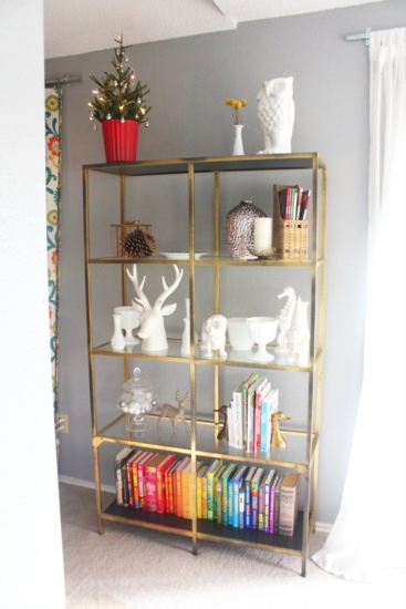 I had a lot of displaced ceramic animals and white vases from re-vamping the mantle and a few other things, so I created an all-white shelf on the bookcase. I love how it looks so much that I think it may be my goal to someday have enough ceramic animals and vases to fill the whole thing up! The only new thing on this bookcase is the adorable little gnome – he’ll only come out at Christmastime!