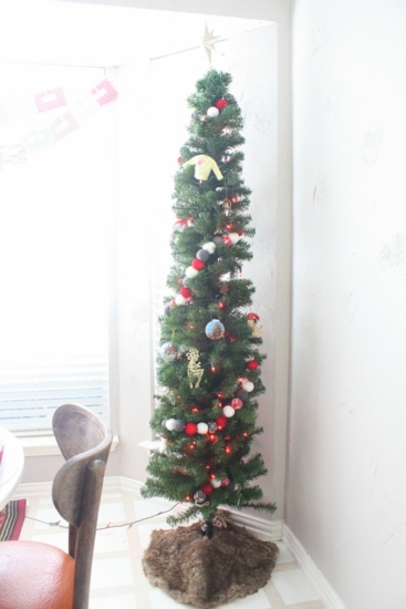 And of course we couldn’t resist a super cute furry tree-skirt for the bottom. It’s technically mean for those tiny little tabletop trees, but we didn’t want anything that covered the ground – just something to disguise the ugly stand. So, this little guy fits the bill perfectly!